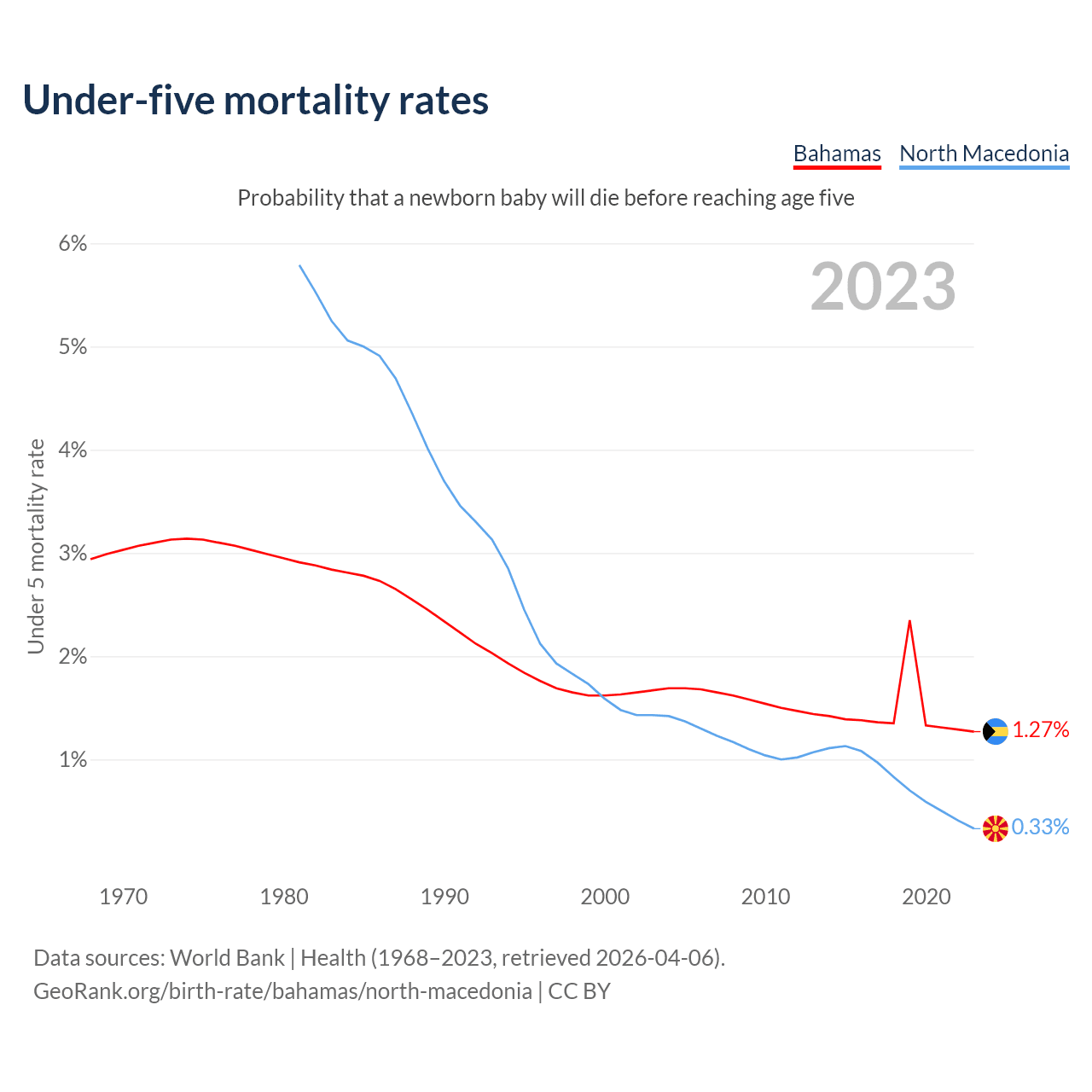 The chance that a newborn baby will die before reaching age five is 1.27% in the Bahamas and 0.33% in North Macedonia. Above is a chart with historical data on under-five mortality rates.