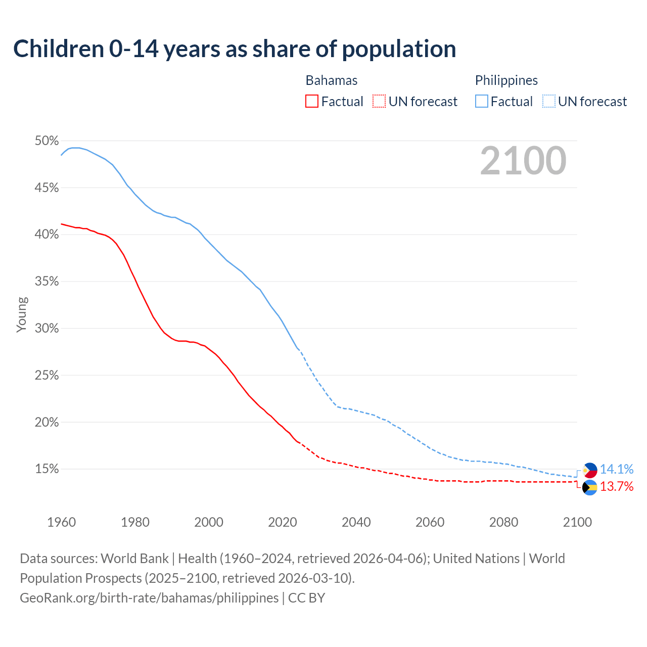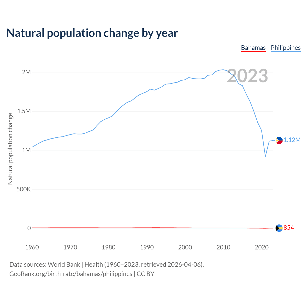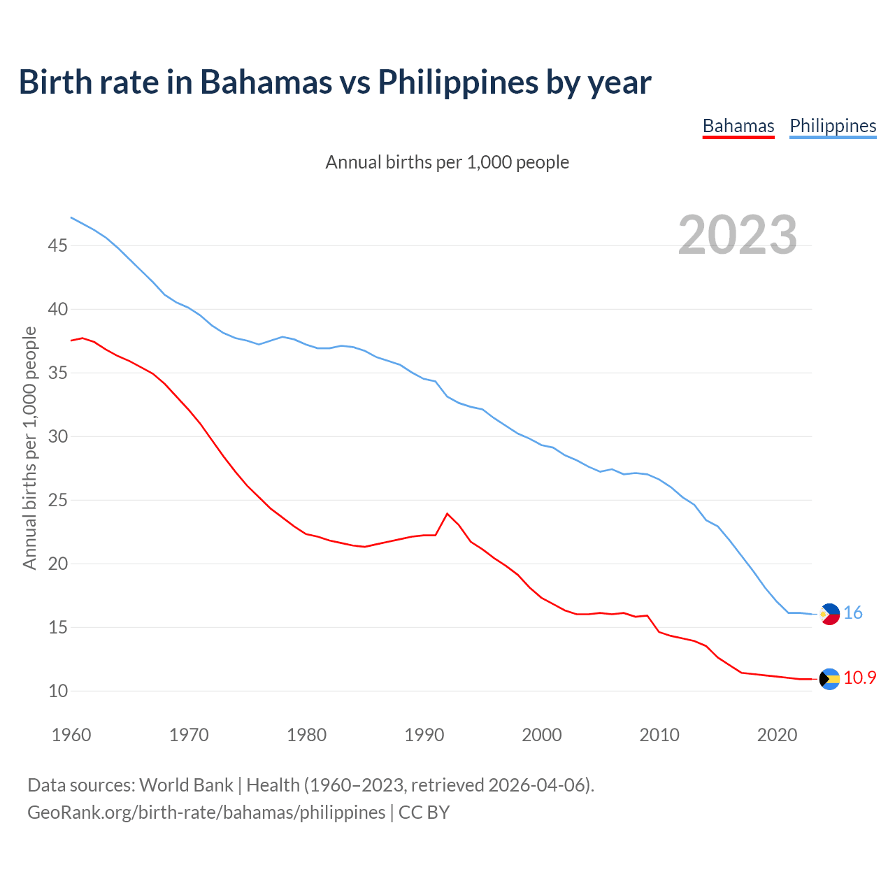 The Bahamas has an annual birth rate of 10.9 births per 1,000 people, compared to 16 for the Philippines. The average number of children a woman is expected to have during her lifetime — the fertility rate, is 1.37 in the Bahamas and 1.92 in the Philippines — 39.5% difference.