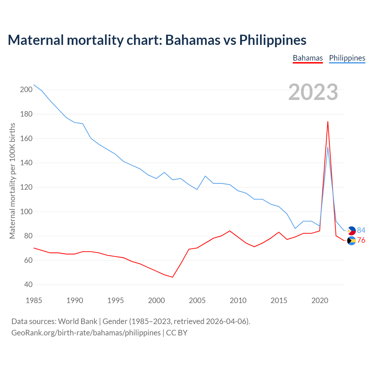 The maternal mortality rate, which is the probability of dying during childbirth or within 42 days of pregnancy termination, is 76 deaths per 100,000 live births in the Bahamas, compared to 84 deaths in the Philippines.
