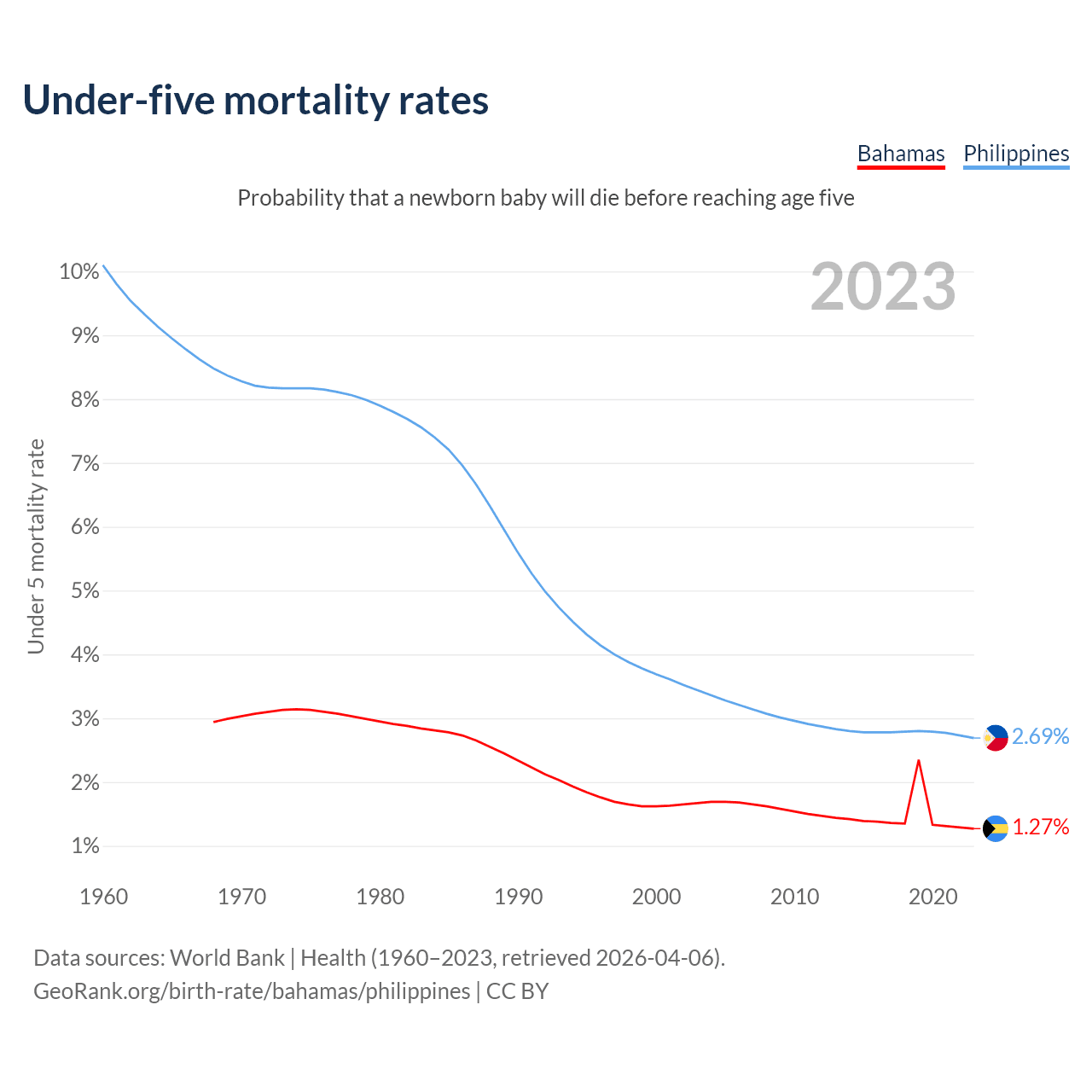 The chance that a newborn baby will die before reaching age five is 1.27% in the Bahamas and 2.69% in the Philippines. Above is a chart with historical data on under-five mortality rates.