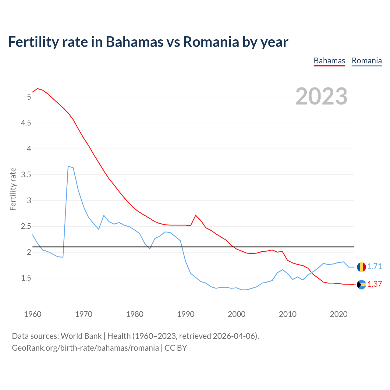 According to the latest available data on birth rates, the fertility rate in the Bahamas was 1.37 children per woman in 2023, compared to 1.71 in Romania in 2023. The replacement level is considered to be 2.1 children per woman.