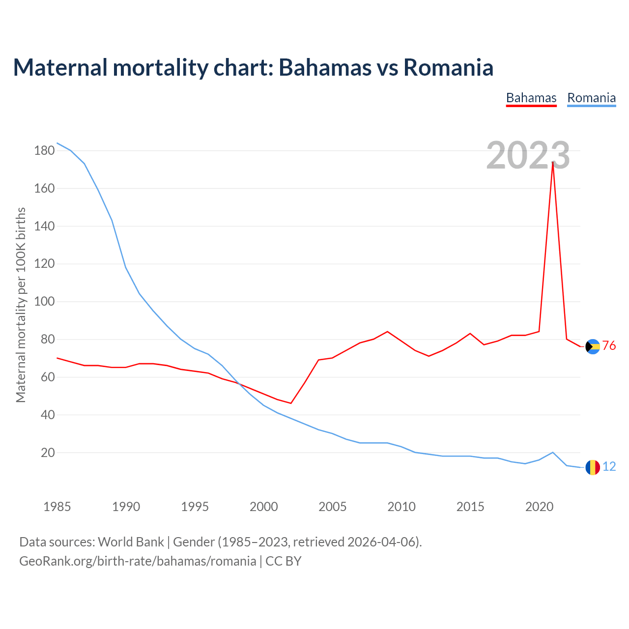 The maternal mortality rate, which is the probability of dying during childbirth or within 42 days of pregnancy termination, is 76 deaths per 100,000 live births in the Bahamas, compared to 12 deaths in Romania.