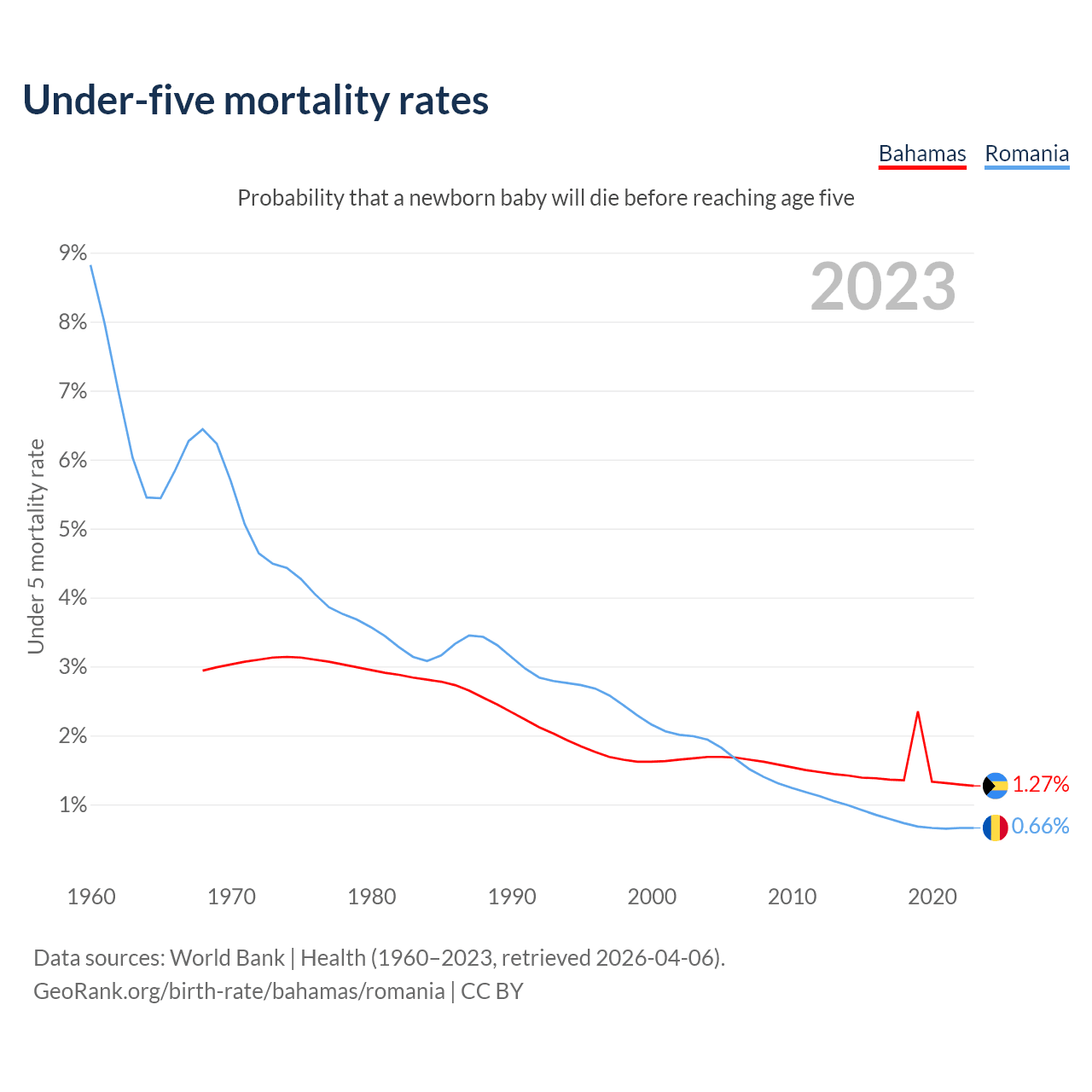 The chance that a newborn baby will die before reaching age five is 1.27% in the Bahamas and 0.66% in Romania. Above is a chart with historical data on under-five mortality rates.