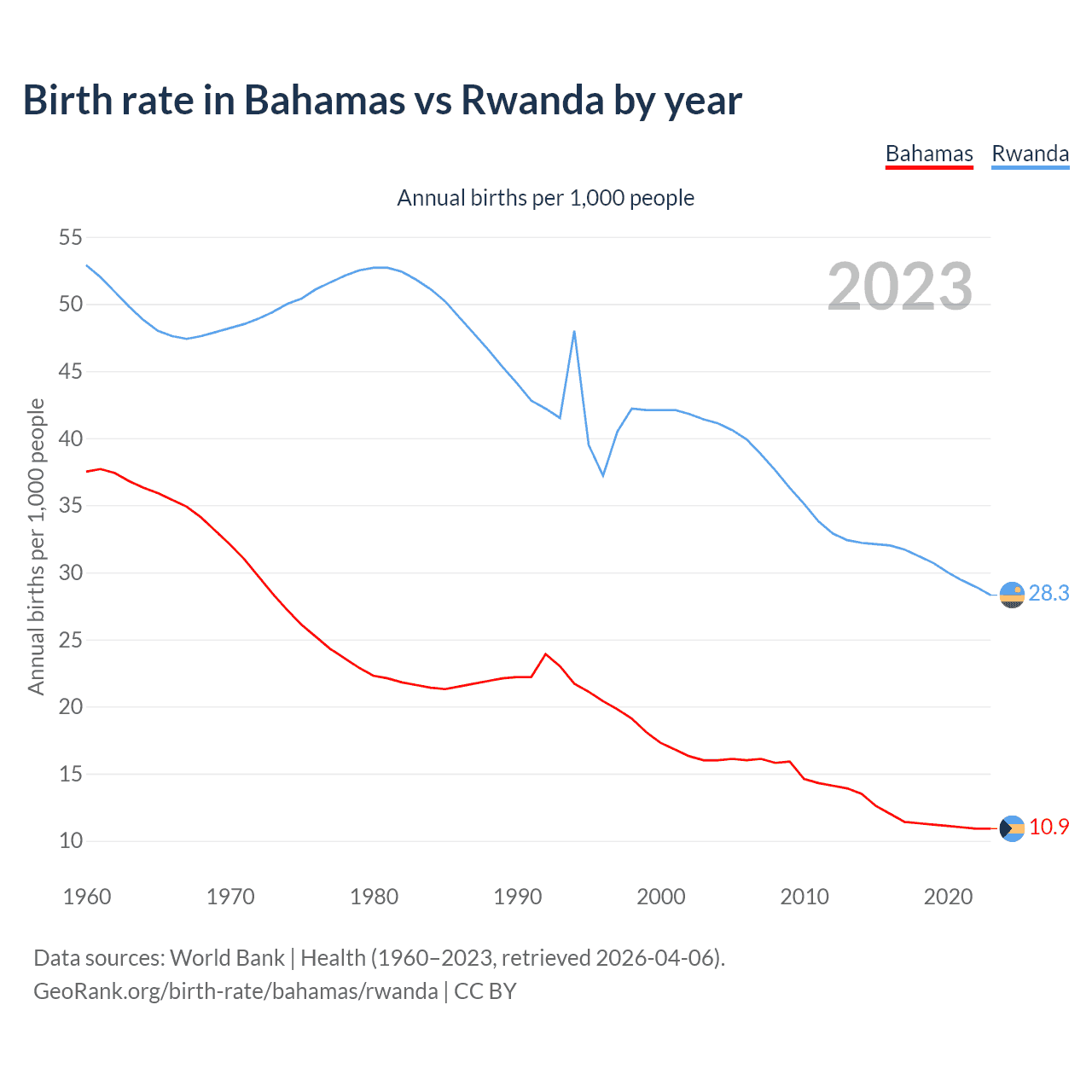 The Bahamas has an annual birth rate of 10.9 births per 1,000 people, compared to 28.3 for Rwanda. The average number of children a woman is expected to have during her lifetime — the fertility rate, is 1.37 in the Bahamas and 3.7 in Rwanda — 169.3% difference.