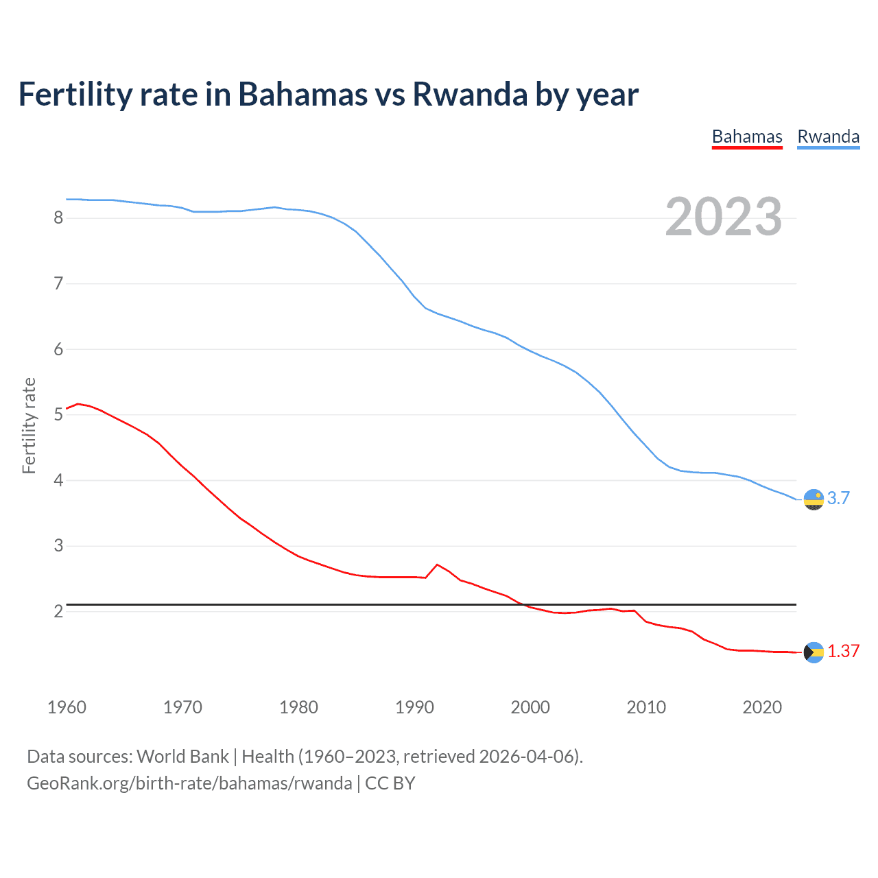 According to the latest available data on birth rates, the fertility rate in the Bahamas was 1.37 children per woman in 2023, compared to 3.7 in Rwanda in 2023. The replacement level is considered to be 2.1 children per woman.