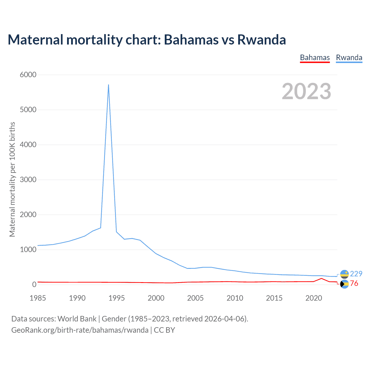 The maternal mortality rate, which is the probability of dying during childbirth or within 42 days of pregnancy termination, is 76 deaths per 100,000 live births in the Bahamas, compared to 229 deaths in Rwanda.