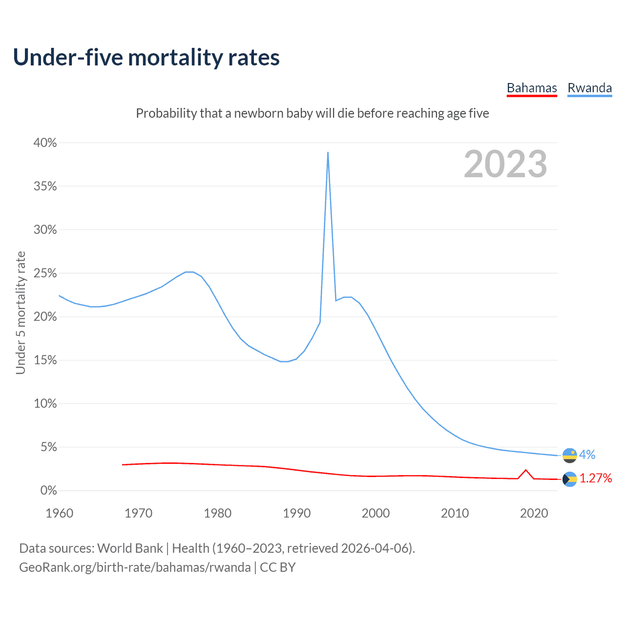 The chance that a newborn baby will die before reaching age five is 1.27% in the Bahamas and 4% in Rwanda. Above is a chart with historical data on under-five mortality rates.