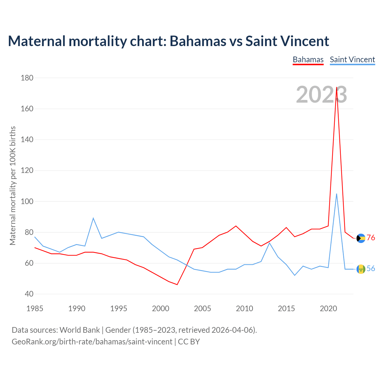 The maternal mortality rate, which is the probability of dying during childbirth or within 42 days of pregnancy termination, is 76 deaths per 100,000 live births in the Bahamas, compared to 56 deaths in Saint Vincent.