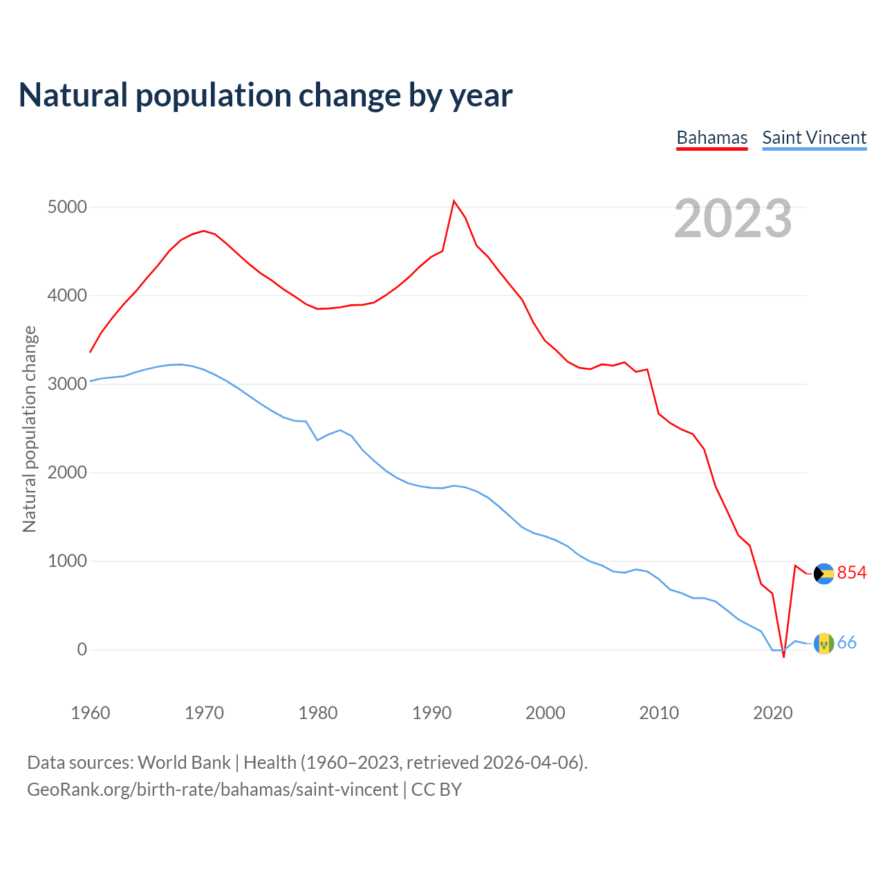 1960 vs 2023, the fertility rate has decreased by 73% in the Bahamas and by 75.5% in Saint Vincent — in 1960, it was 5.09 and 7.25, respectively.