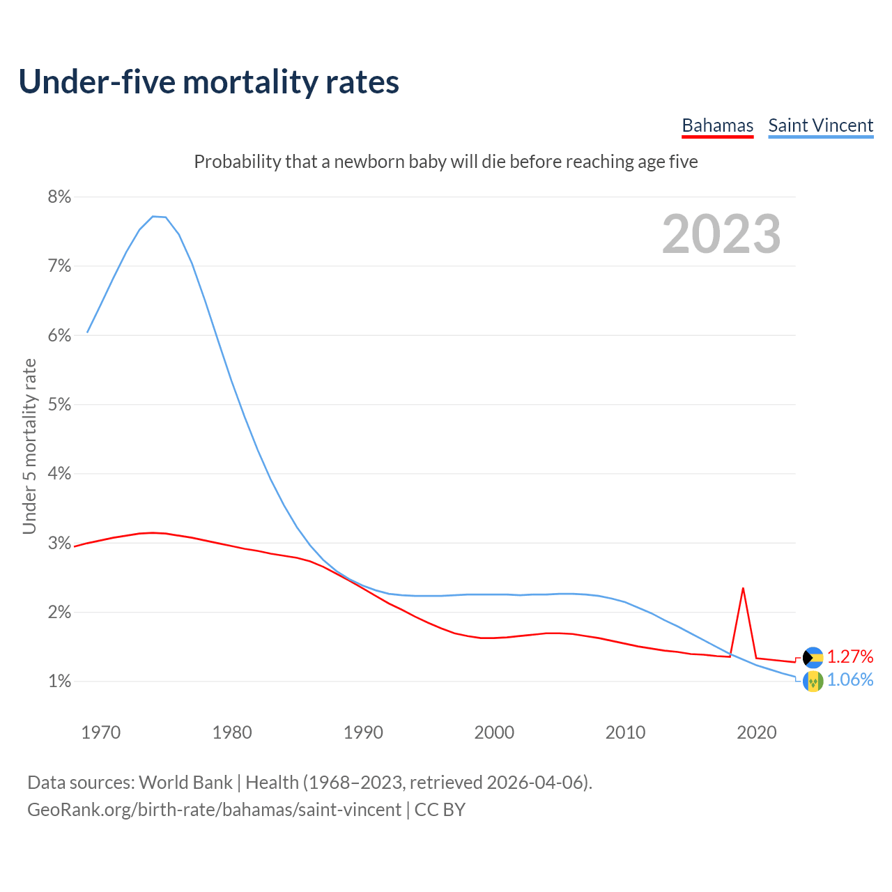 The chance that a newborn baby will die before reaching age five is 1.27% in the Bahamas and 1.06% in Saint Vincent. Above is a chart with historical data on under-five mortality rates.