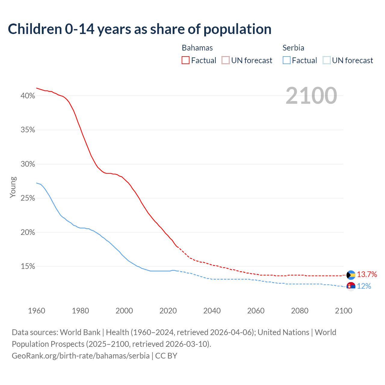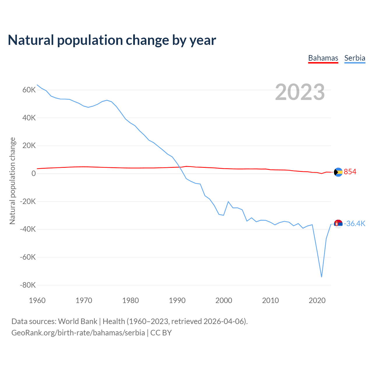 According to the latest available data on birth rates, the fertility rate in the Bahamas was 1.37 children per woman in 2023, compared to 1.61 in Serbia in 2023. The replacement level is considered to be 2.1 children per woman.