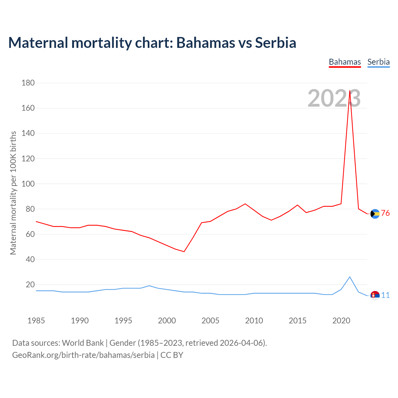 The maternal mortality rate, which is the probability of dying during childbirth or within 42 days of pregnancy termination, is 76 deaths per 100,000 live births in the Bahamas, compared to 11 deaths in Serbia.