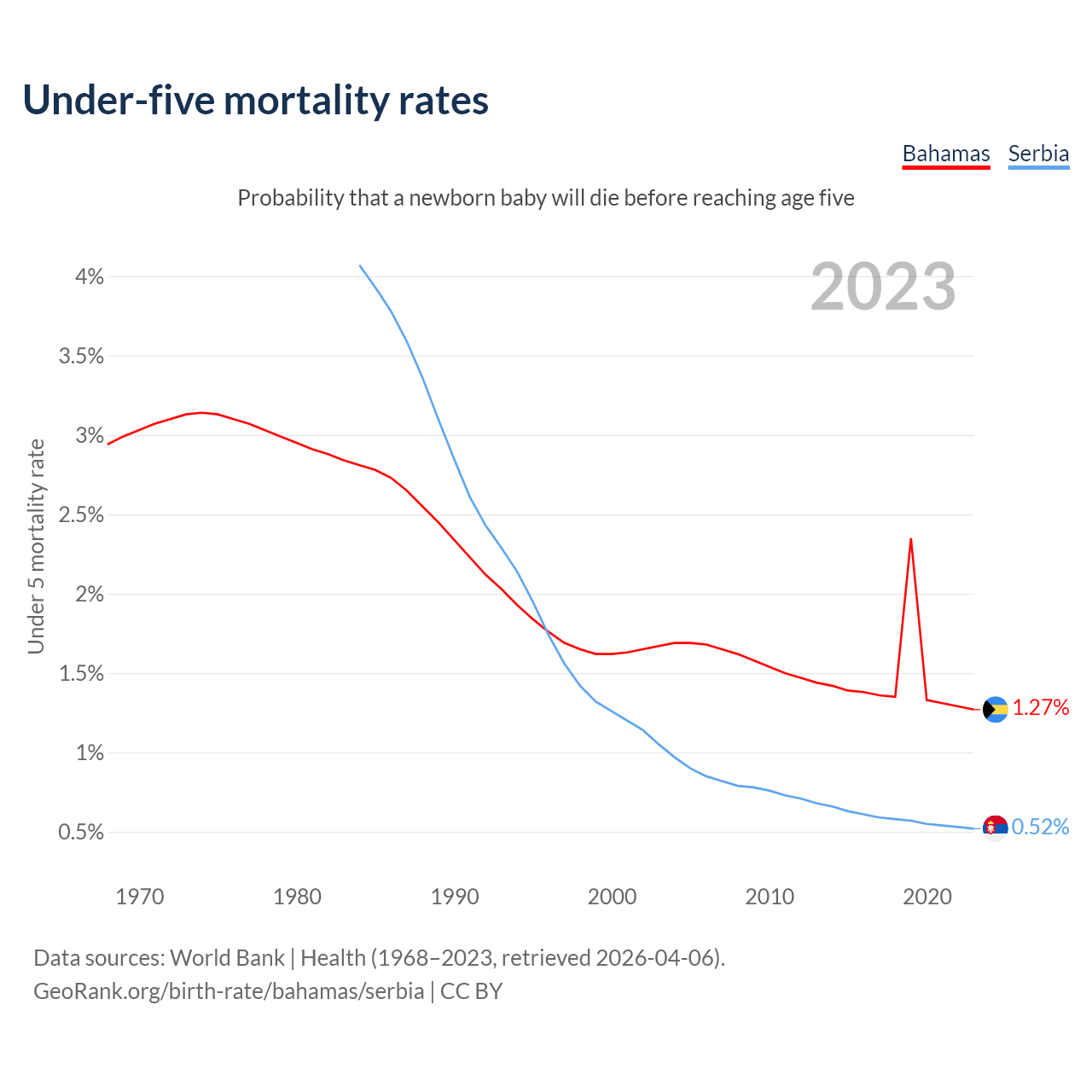 The chance that a newborn baby will die before reaching age five is 1.27% in the Bahamas and 0.52% in Serbia. Above is a chart with historical data on under-five mortality rates.