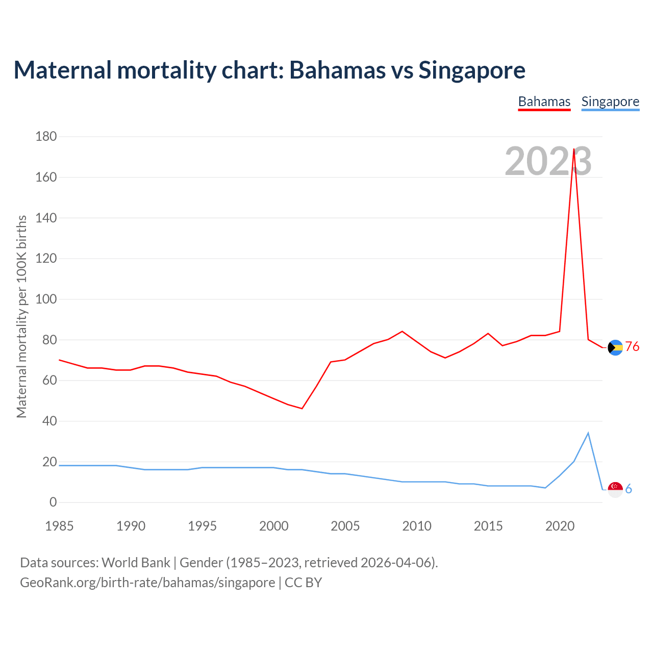 The maternal mortality rate, which is the probability of dying during childbirth or within 42 days of pregnancy termination, is 76 deaths per 100,000 live births in the Bahamas, compared to 6 deaths in Singapore.