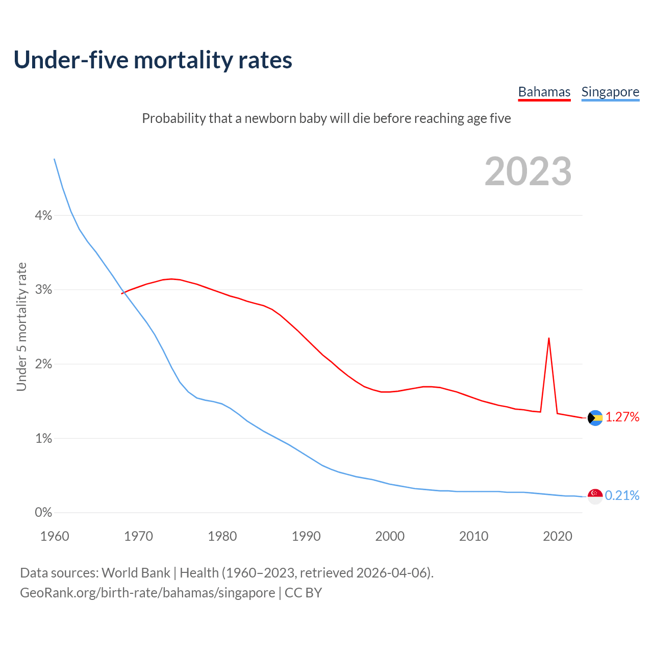 The chance that a newborn baby will die before reaching age five is 1.27% in the Bahamas and 0.21% in Singapore. Above is a chart with historical data on under-five mortality rates.