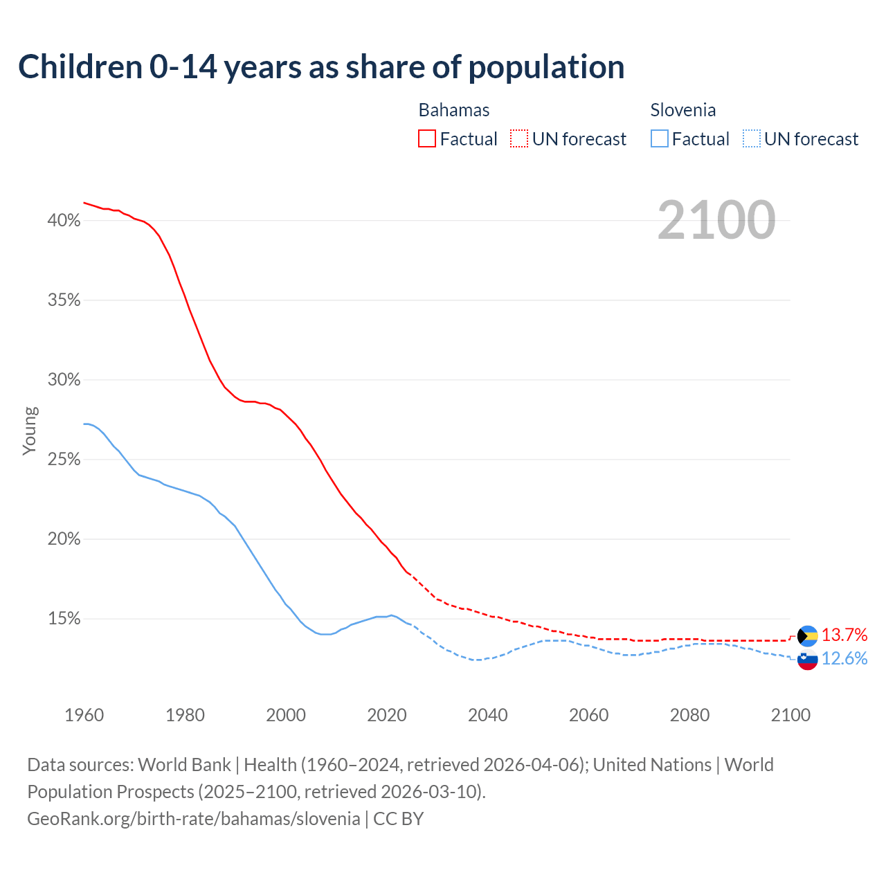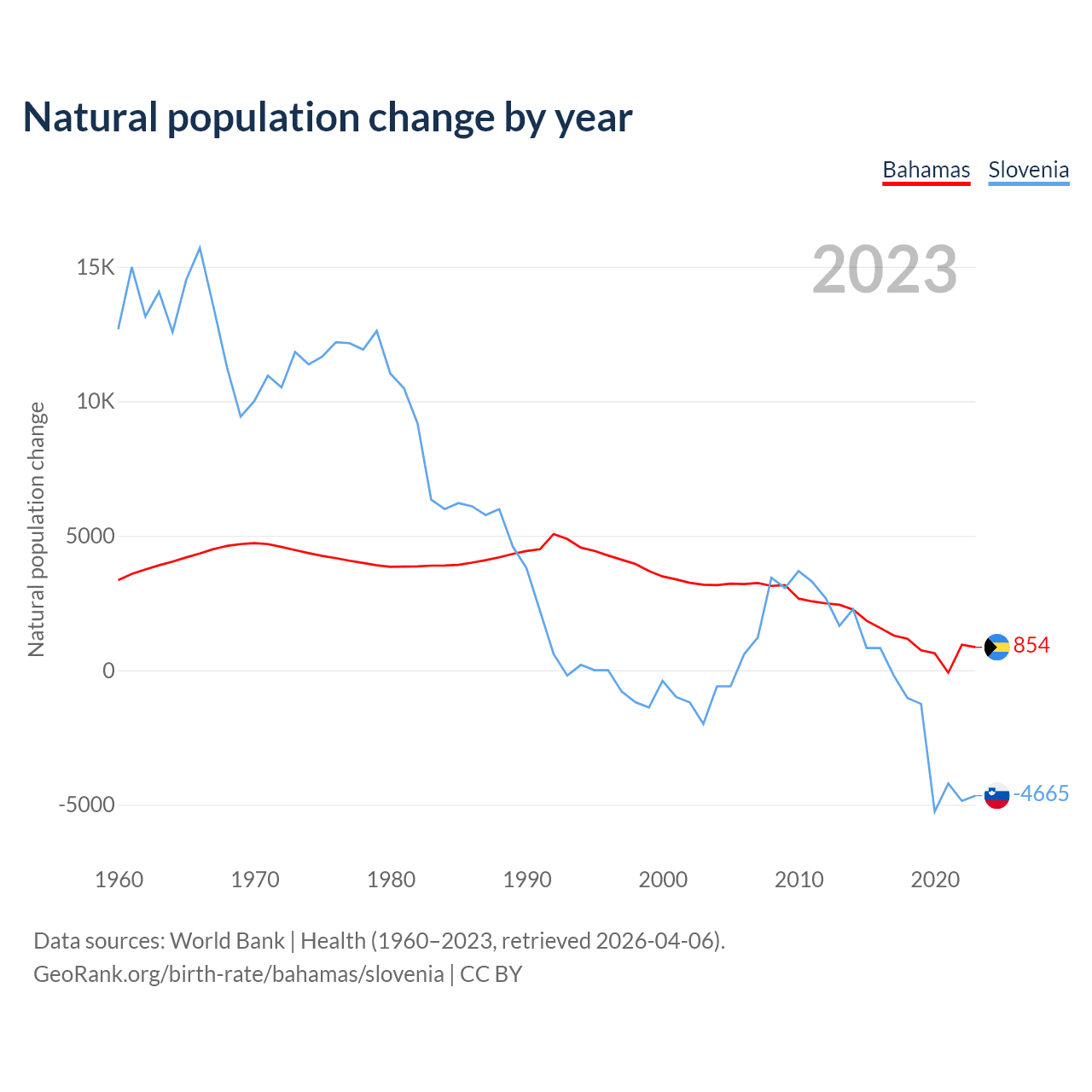 According to the latest available data on birth rates, the fertility rate in the Bahamas was 1.37 children per woman in 2023, compared to 1.51 in Slovenia in 2023. The replacement level is considered to be 2.1 children per woman.