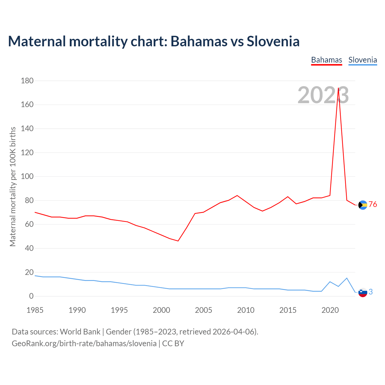 The maternal mortality rate, which is the probability of dying during childbirth or within 42 days of pregnancy termination, is 76 deaths per 100,000 live births in the Bahamas, compared to 3 deaths in Slovenia.