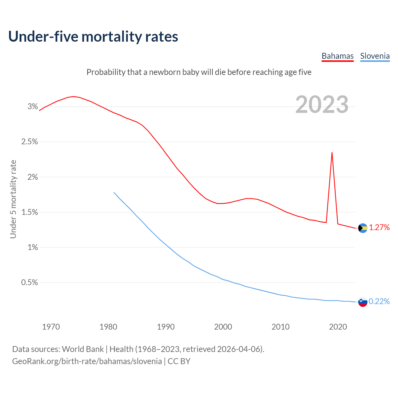 The chance that a newborn baby will die before reaching age five is 1.27% in the Bahamas and 0.22% in Slovenia. Above is a chart with historical data on under-five mortality rates.