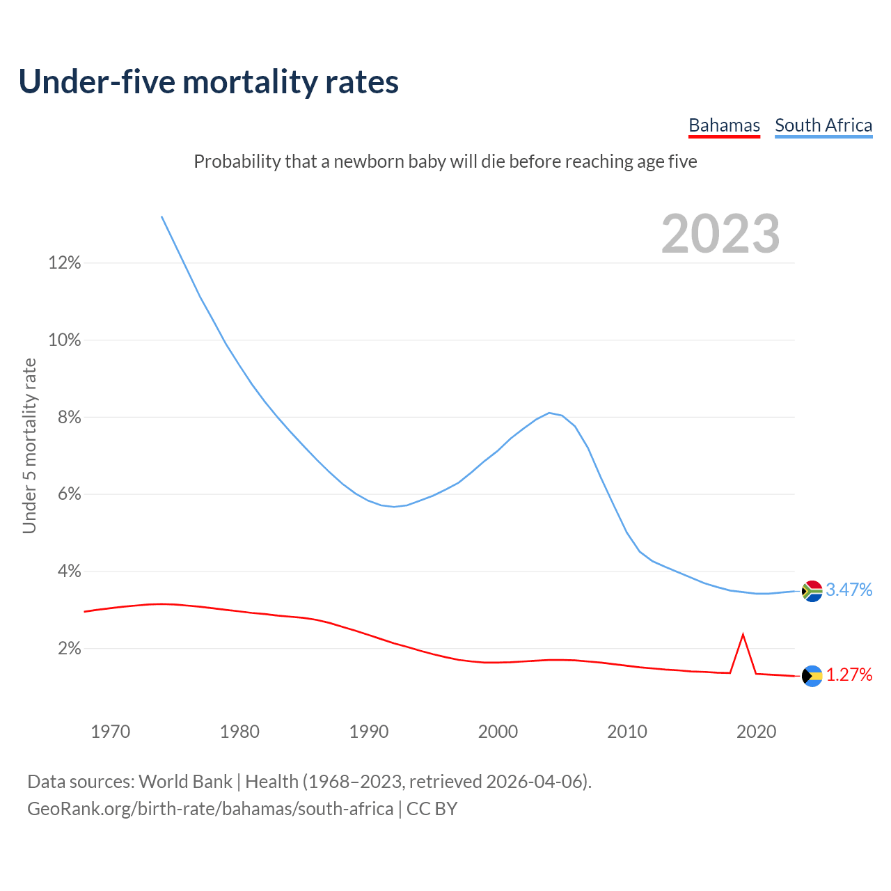 The chance that a newborn baby will die before reaching age five is 1.27% in the Bahamas and 3.47% in South Africa. Above is a chart with historical data on under-five mortality rates.