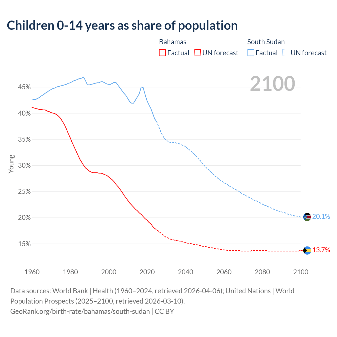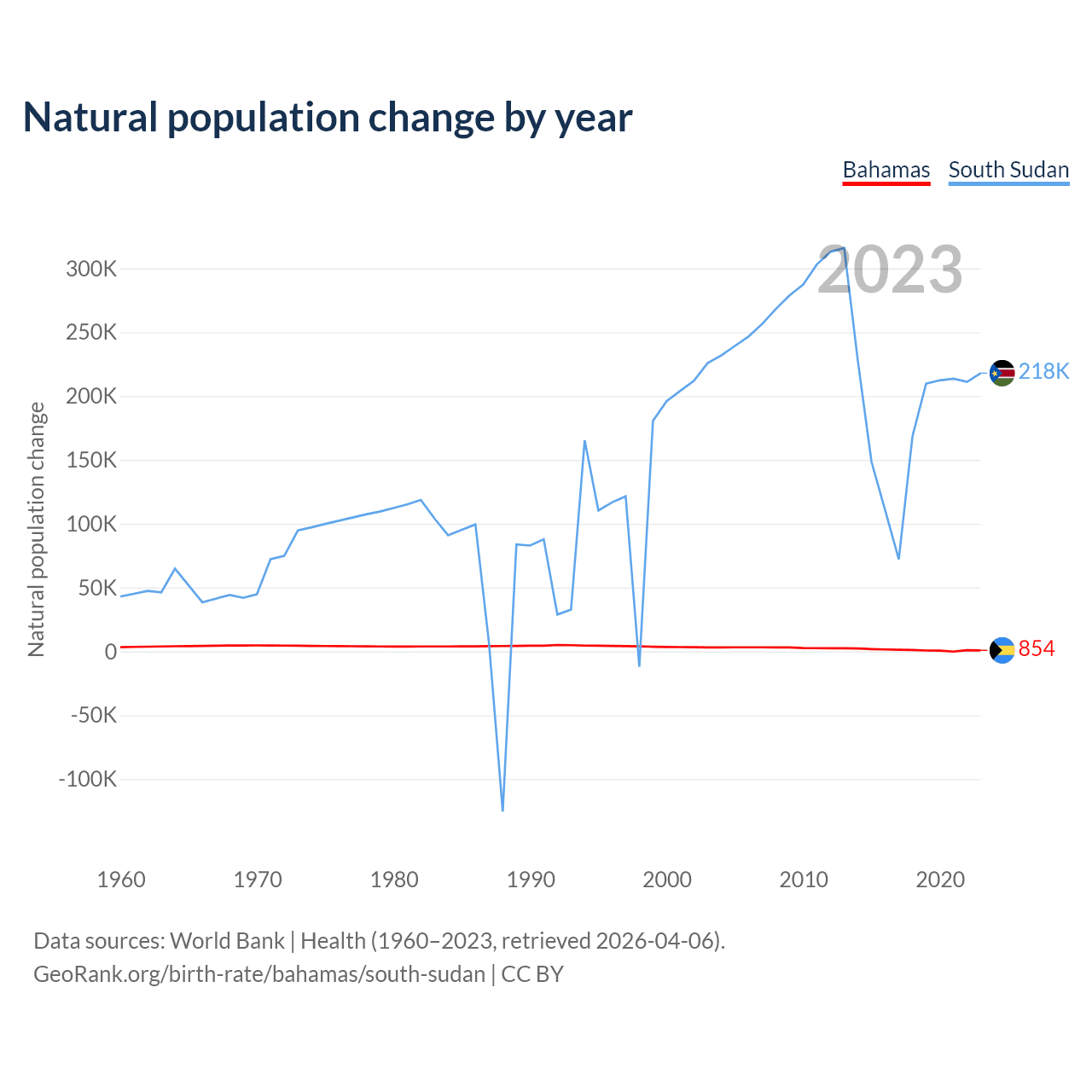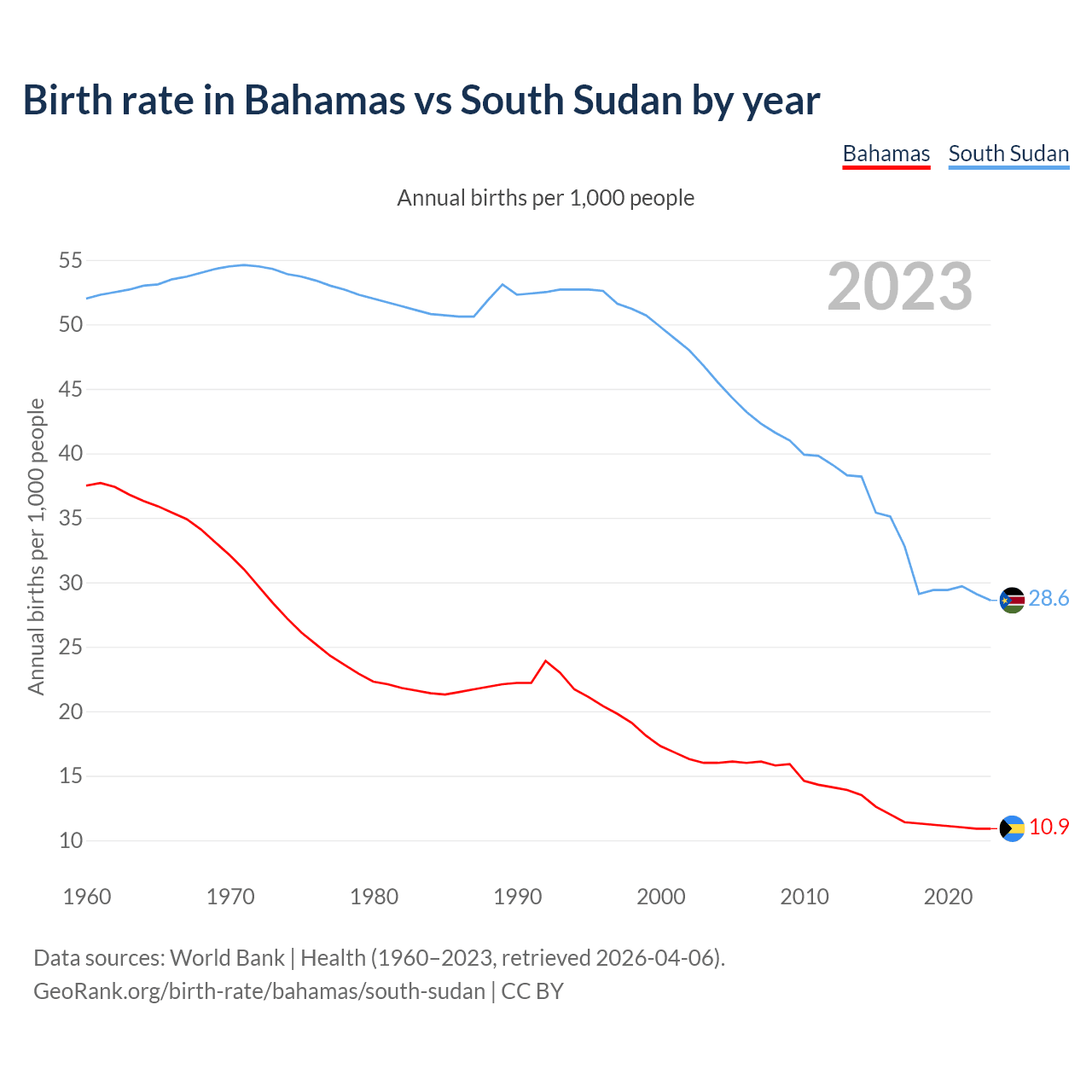The Bahamas has an annual birth rate of 10.9 births per 1,000 people, compared to 28.6 for South Sudan. The average number of children a woman is expected to have during her lifetime — the fertility rate, is 1.37 in the Bahamas and 3.86 in South Sudan — 181.4% difference.