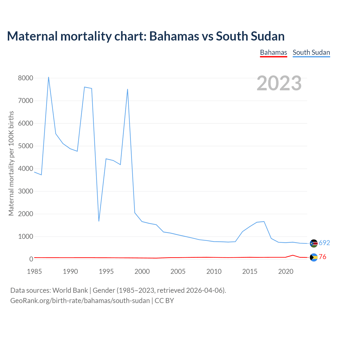 The maternal mortality rate, which is the probability of dying during childbirth or within 42 days of pregnancy termination, is 76 deaths per 100,000 live births in the Bahamas, compared to 692 deaths in South Sudan.