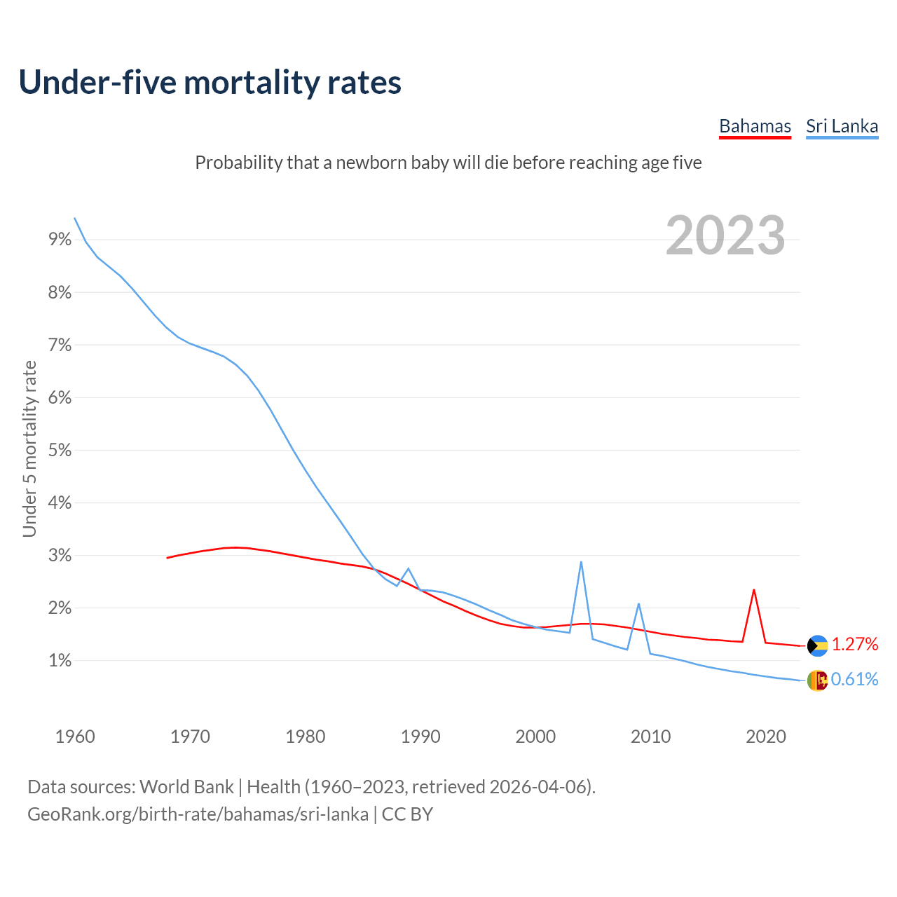 The chance that a newborn baby will die before reaching age five is 1.27% in the Bahamas and 0.61% in Sri Lanka. Above is a chart with historical data on under-five mortality rates.