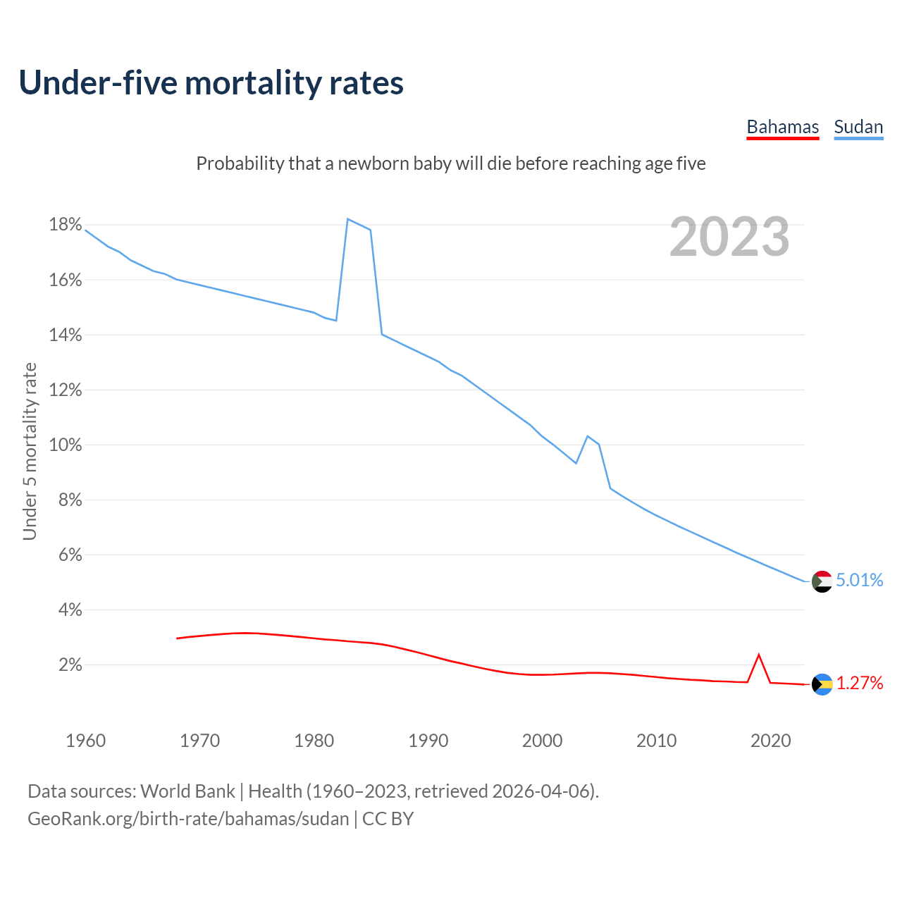The chance that a newborn baby will die before reaching age five is 1.27% in the Bahamas and 5.01% in Sudan. Above is a chart with historical data on under-five mortality rates.