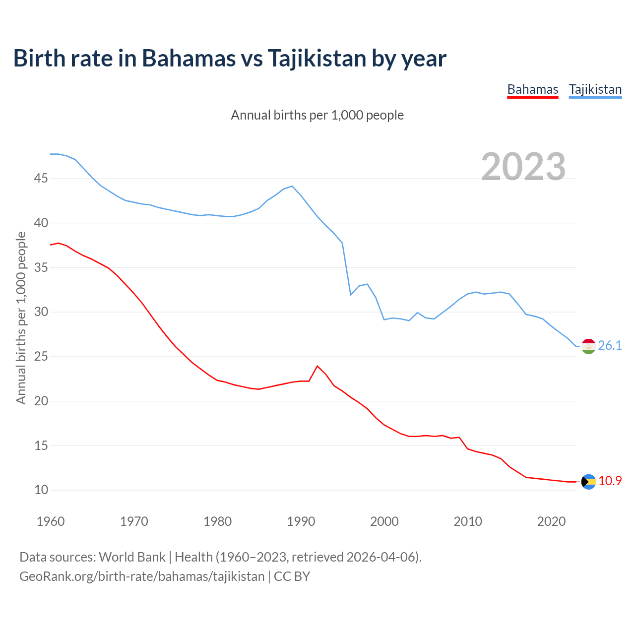 The Bahamas has an annual birth rate of 10.9 births per 1,000 people, compared to 26.1 for Tajikistan. The average number of children a woman is expected to have during her lifetime — the fertility rate, is 1.37 in the Bahamas and 3.07 in Tajikistan — 123.7% difference.