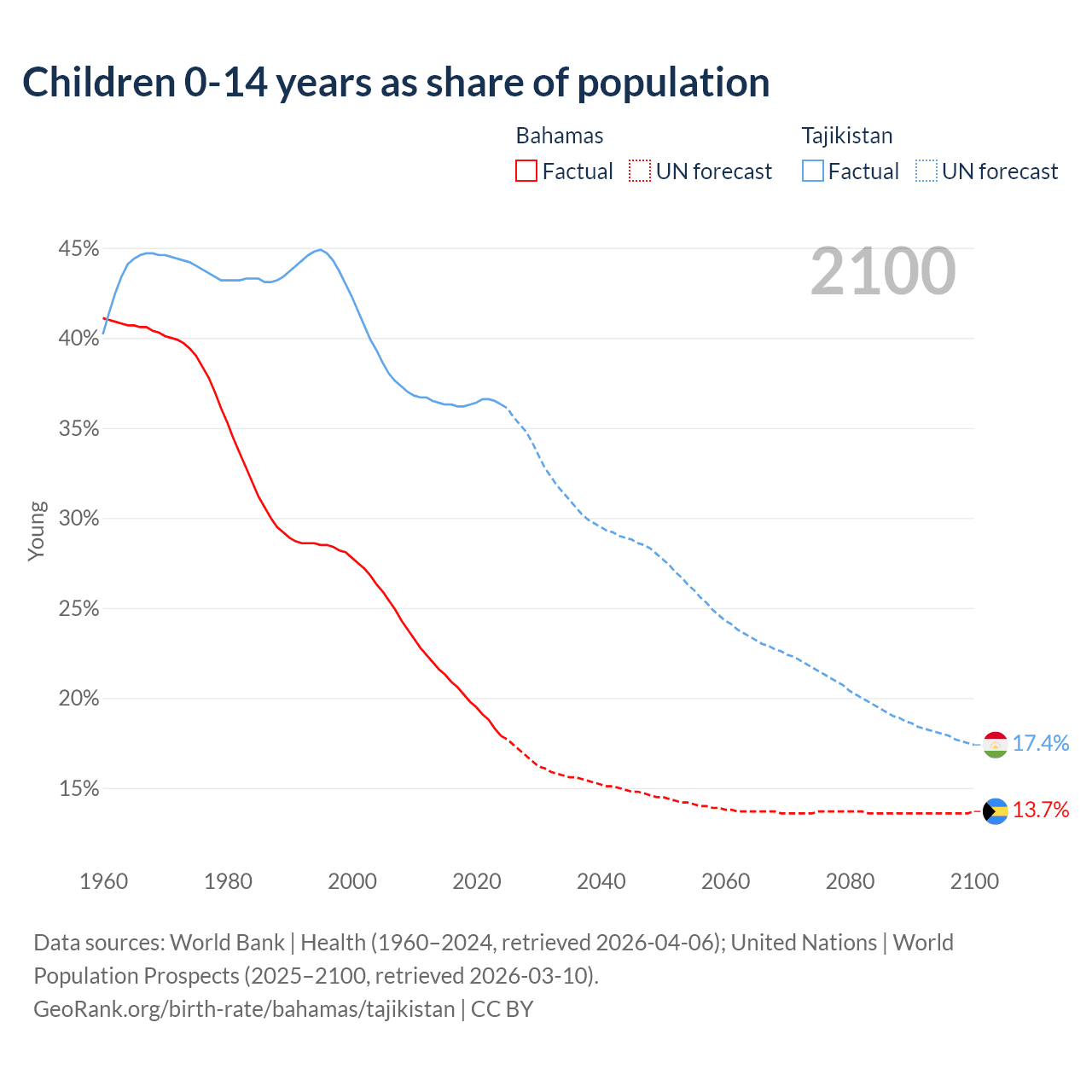 According to the latest available data on birth rates, the fertility rate in the Bahamas was 1.37 children per woman in 2023, compared to 3.07 in Tajikistan in 2023. The replacement level is considered to be 2.1 children per woman.