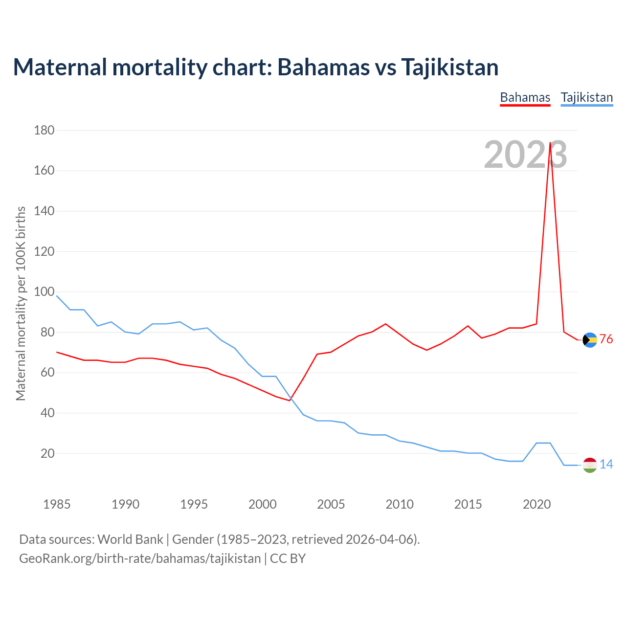 The maternal mortality rate, which is the probability of dying during childbirth or within 42 days of pregnancy termination, is 76 deaths per 100,000 live births in the Bahamas, compared to 14 deaths in Tajikistan.