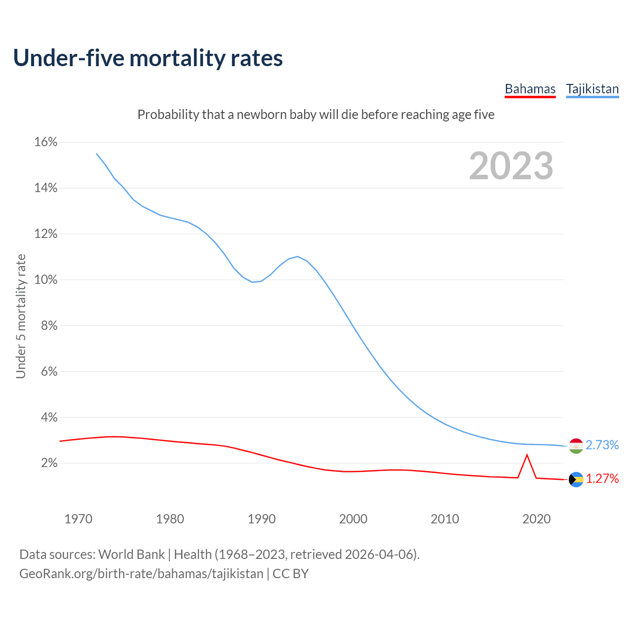 The chance that a newborn baby will die before reaching age five is 1.27% in the Bahamas and 2.73% in Tajikistan. Above is a chart with historical data on under-five mortality rates.