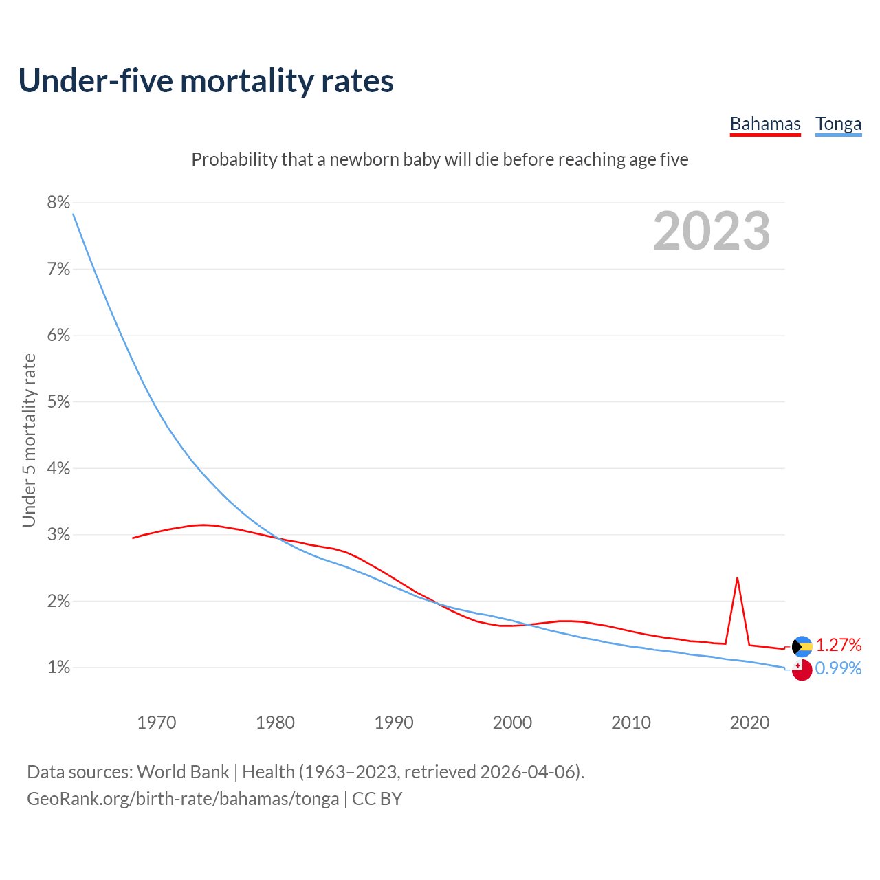 The chance that a newborn baby will die before reaching age five is 1.27% in the Bahamas and 0.99% in Tonga. Above is a chart with historical data on under-five mortality rates.