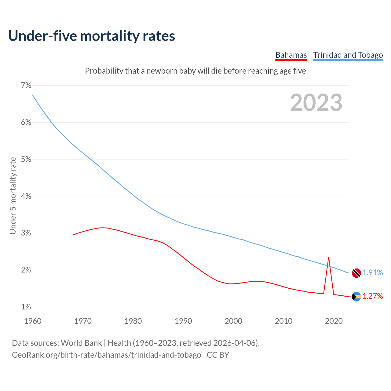 The chance that a newborn baby will die before reaching age five is 1.27% in the Bahamas and 1.91% in Trinidad and Tobago. Above is a chart with historical data on under-five mortality rates.