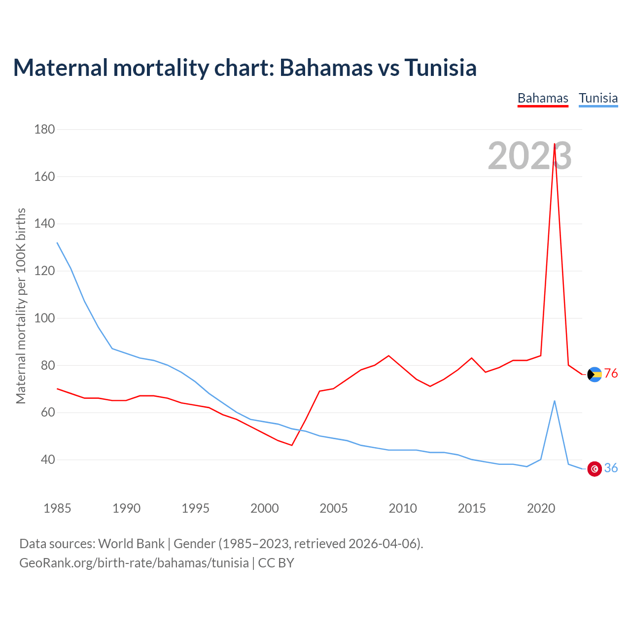 The maternal mortality rate, which is the probability of dying during childbirth or within 42 days of pregnancy termination, is 76 deaths per 100,000 live births in the Bahamas, compared to 36 deaths in Tunisia.