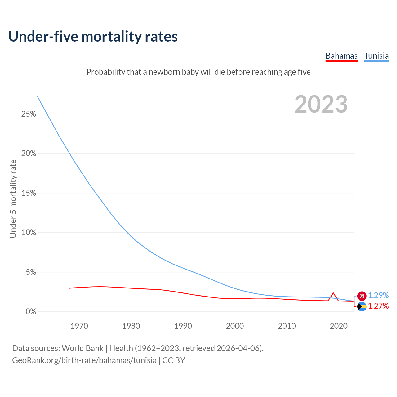 The chance that a newborn baby will die before reaching age five is 1.27% in the Bahamas and 1.29% in Tunisia. Above is a chart with historical data on under-five mortality rates.
