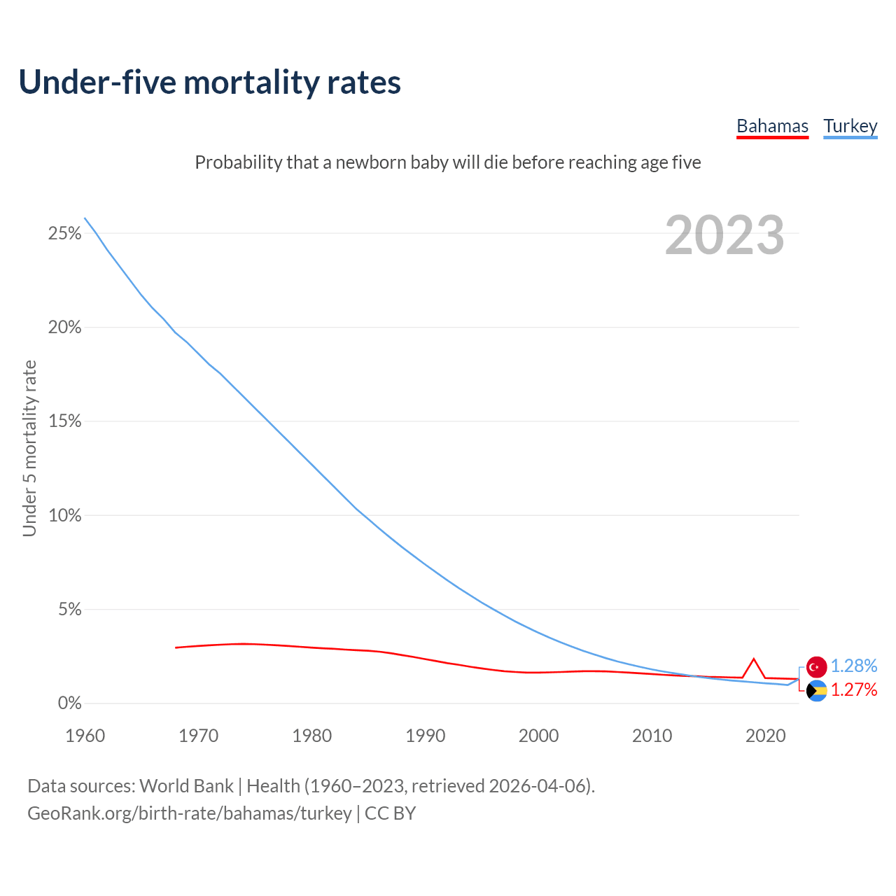 The chance that a newborn baby will die before reaching age five is 1.27% in the Bahamas and 1.28% in Turkey. Above is a chart with historical data on under-five mortality rates.