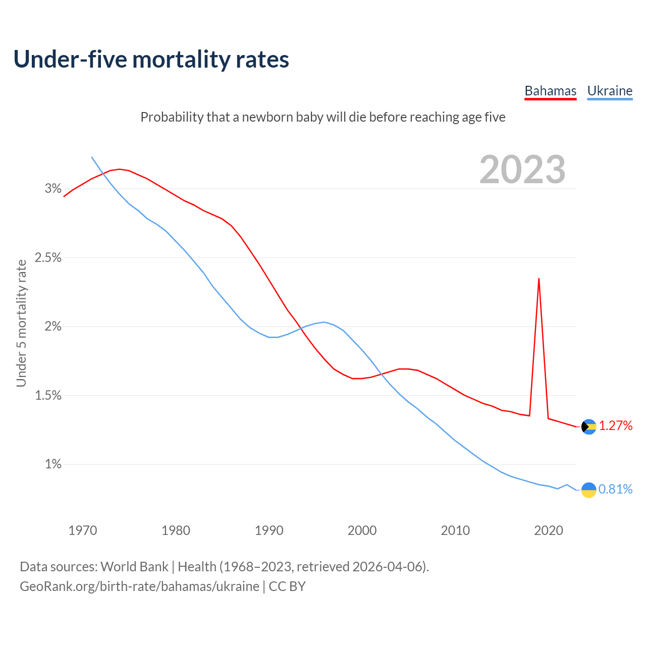 The chance that a newborn baby will die before reaching age five is 1.27% in the Bahamas and 0.81% in Ukraine. Above is a chart with historical data on under-five mortality rates.