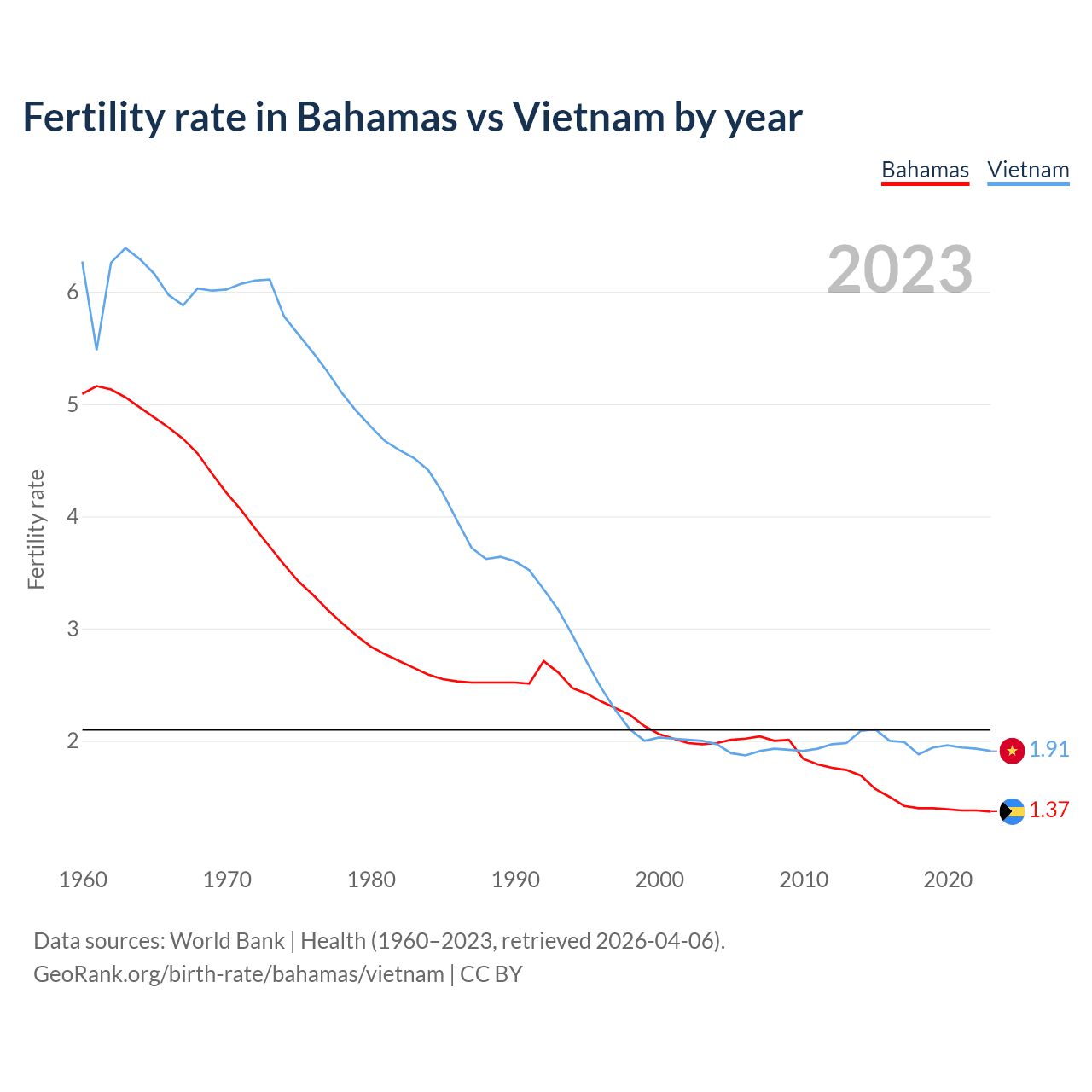 1960 vs 2023, the fertility rate has decreased by 73% in the Bahamas and by 69.5% in Vietnam — in 1960, it was 5.09 and 6.27, respectively.