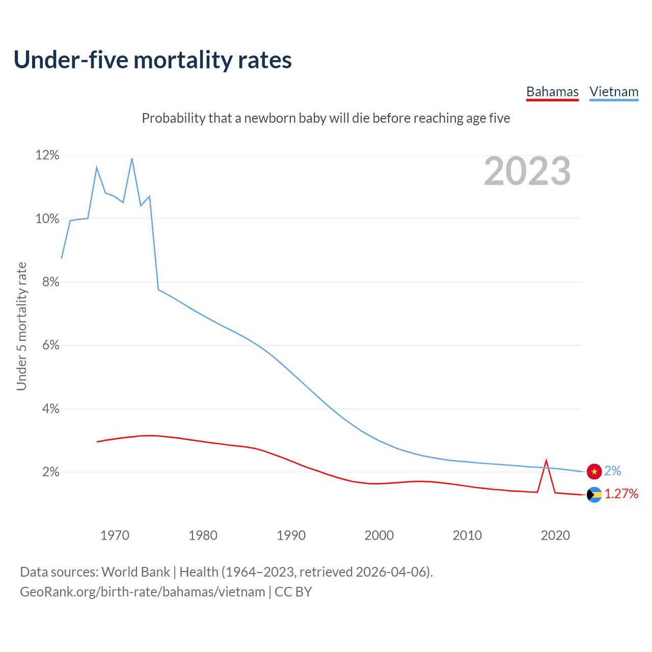 The chance that a newborn baby will die before reaching age five is 1.27% in the Bahamas and 2% in Vietnam. Above is a chart with historical data on under-five mortality rates.