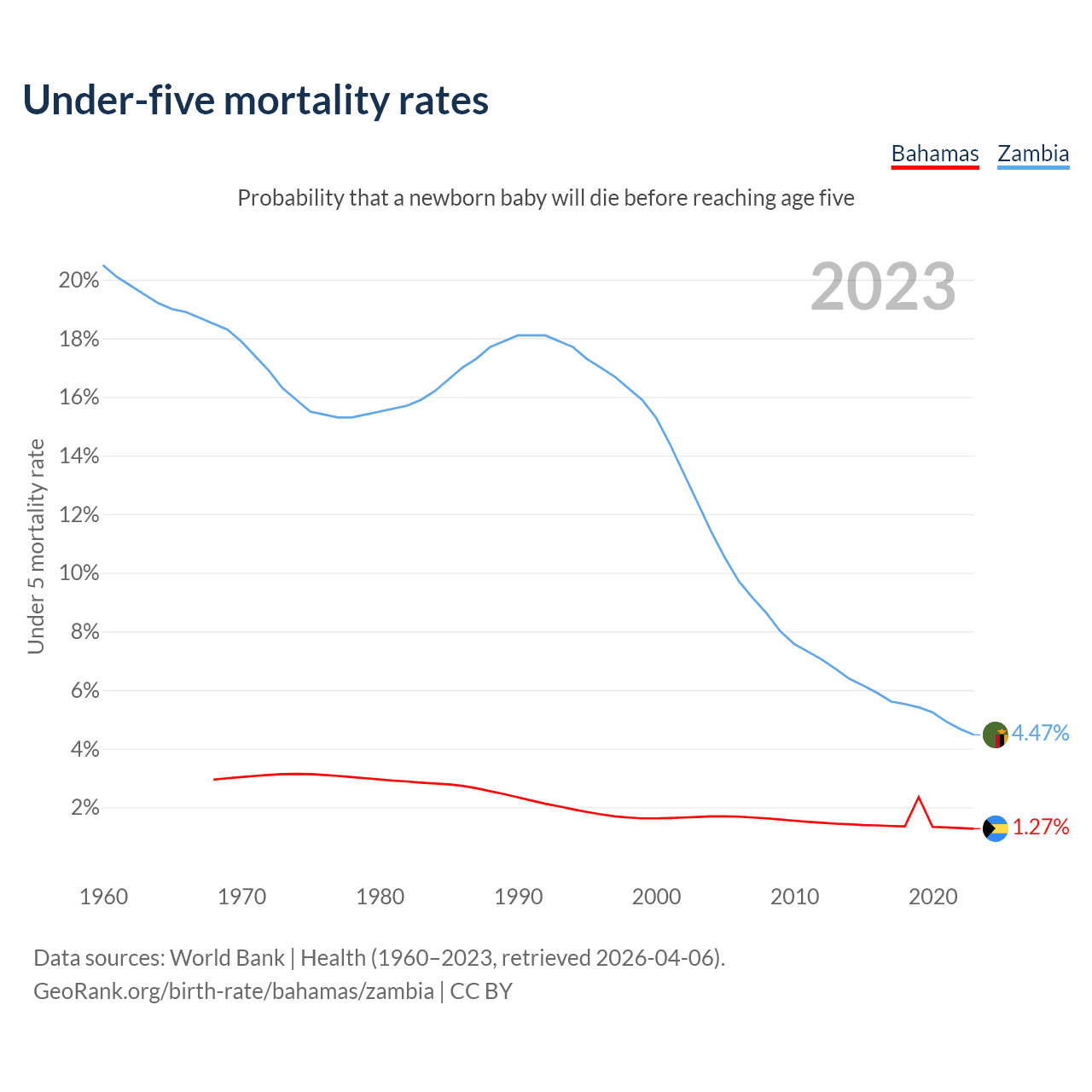 The chance that a newborn baby will die before reaching age five is 1.27% in the Bahamas and 4.47% in Zambia. Above is a chart with historical data on under-five mortality rates.