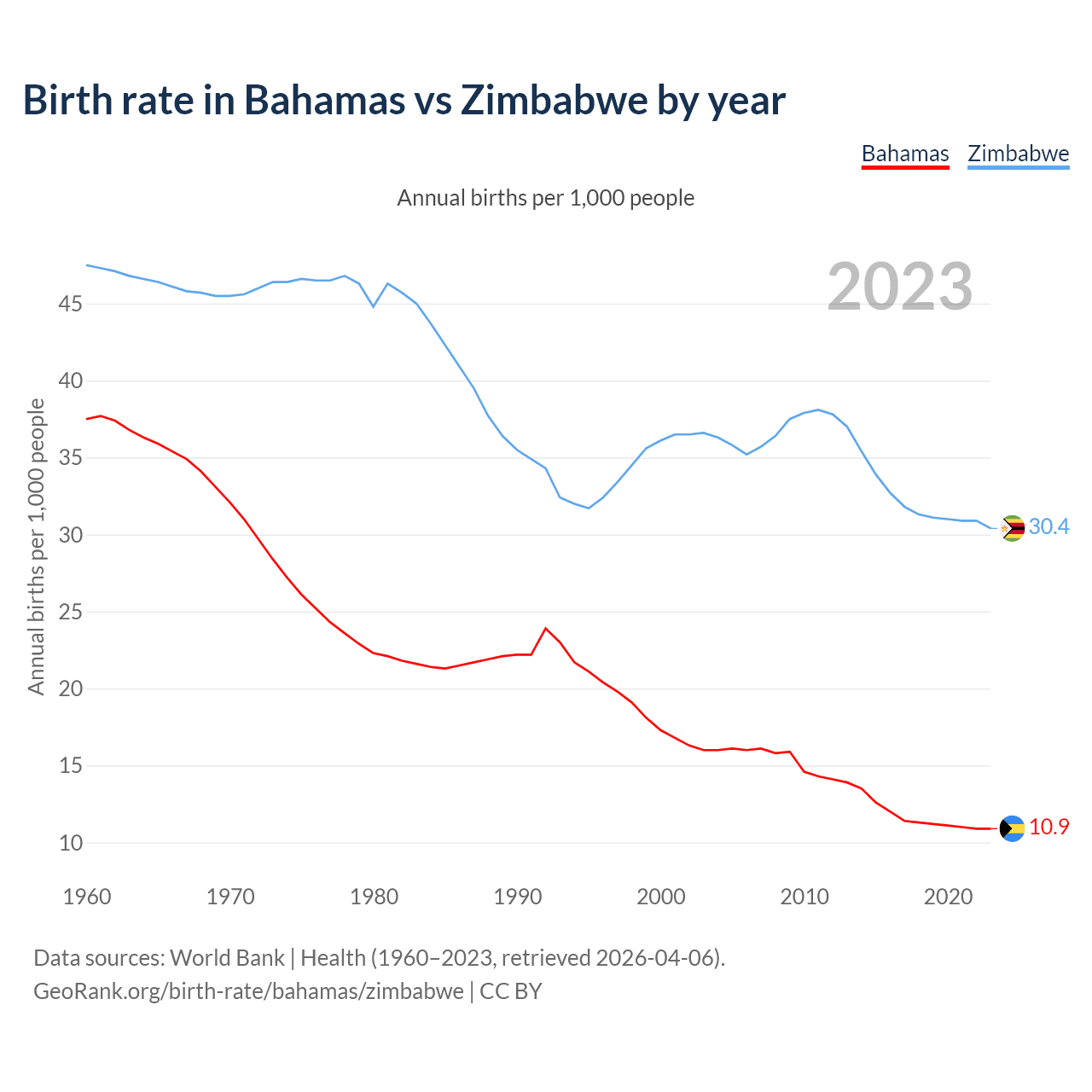 The Bahamas has an annual birth rate of 10.9 births per 1,000 people, compared to 30.4 for Zimbabwe. The average number of children a woman is expected to have during her lifetime — the fertility rate, is 1.37 in the Bahamas and 3.72 in Zimbabwe — 171.2% difference.