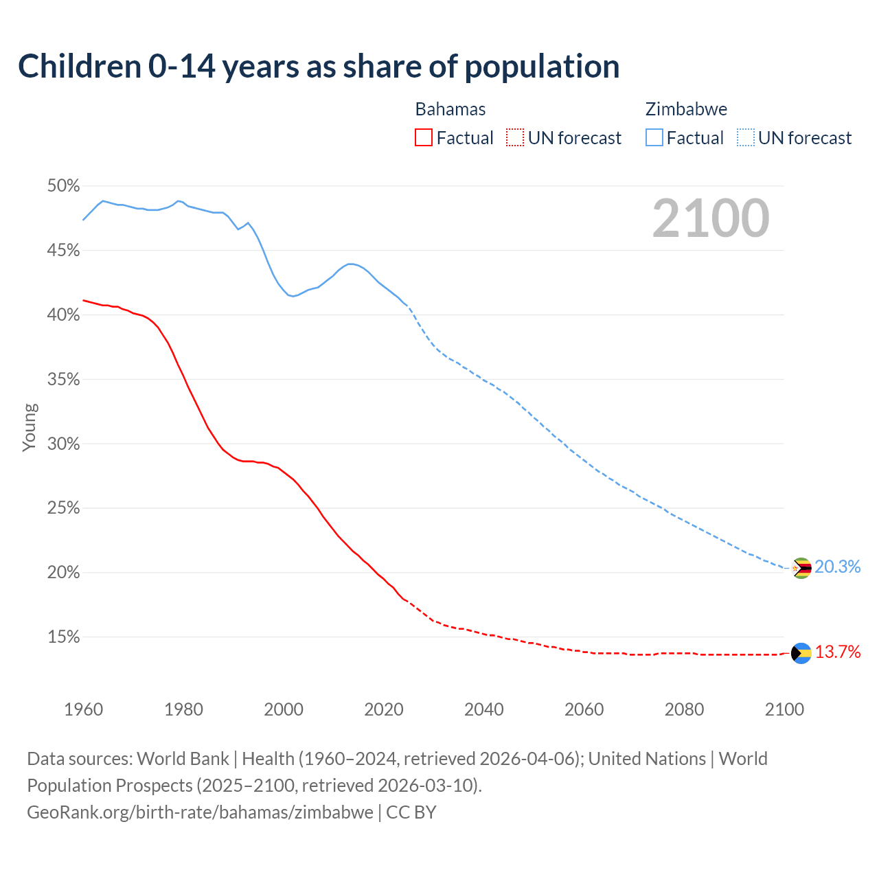 According to the latest available data on birth rates, the fertility rate in the Bahamas was 1.37 children per woman in 2023, compared to 3.72 in Zimbabwe in 2023. The replacement level is considered to be 2.1 children per woman.