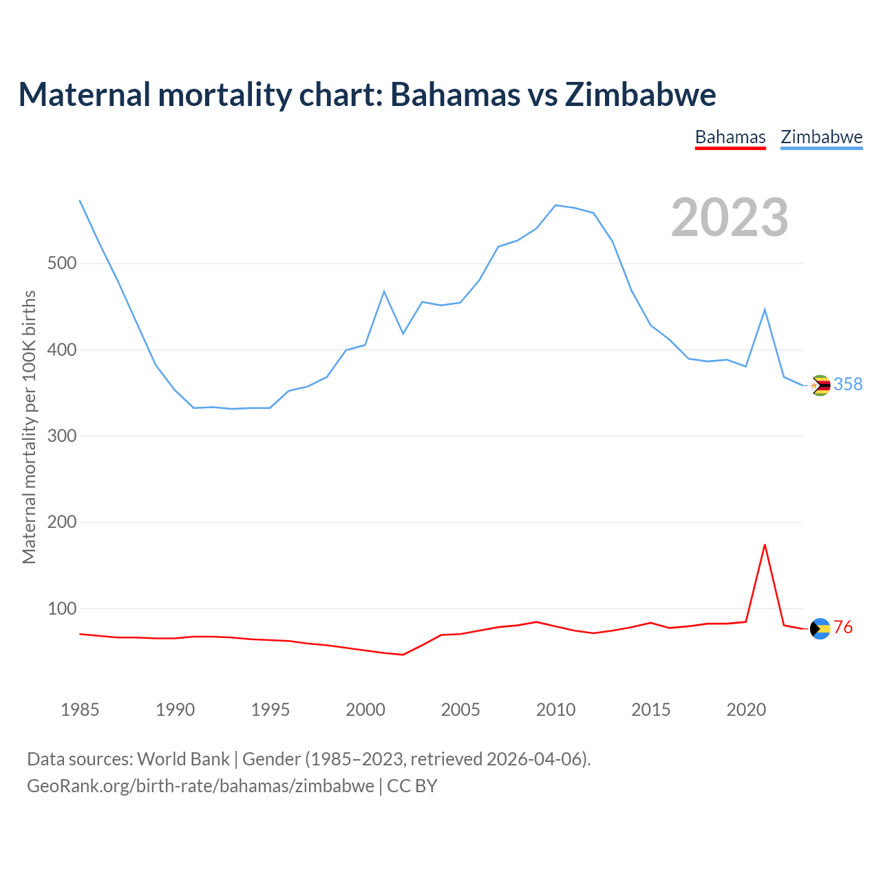 The maternal mortality rate, which is the probability of dying during childbirth or within 42 days of pregnancy termination, is 76 deaths per 100,000 live births in the Bahamas, compared to 358 deaths in Zimbabwe.