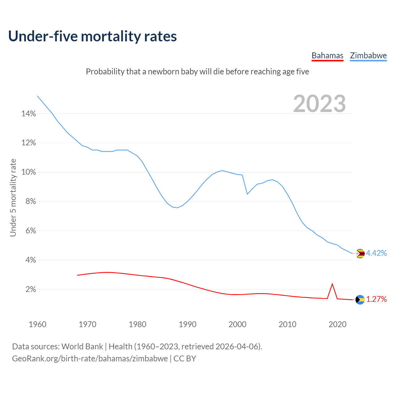 The chance that a newborn baby will die before reaching age five is 1.27% in the Bahamas and 4.42% in Zimbabwe. Above is a chart with historical data on under-five mortality rates.