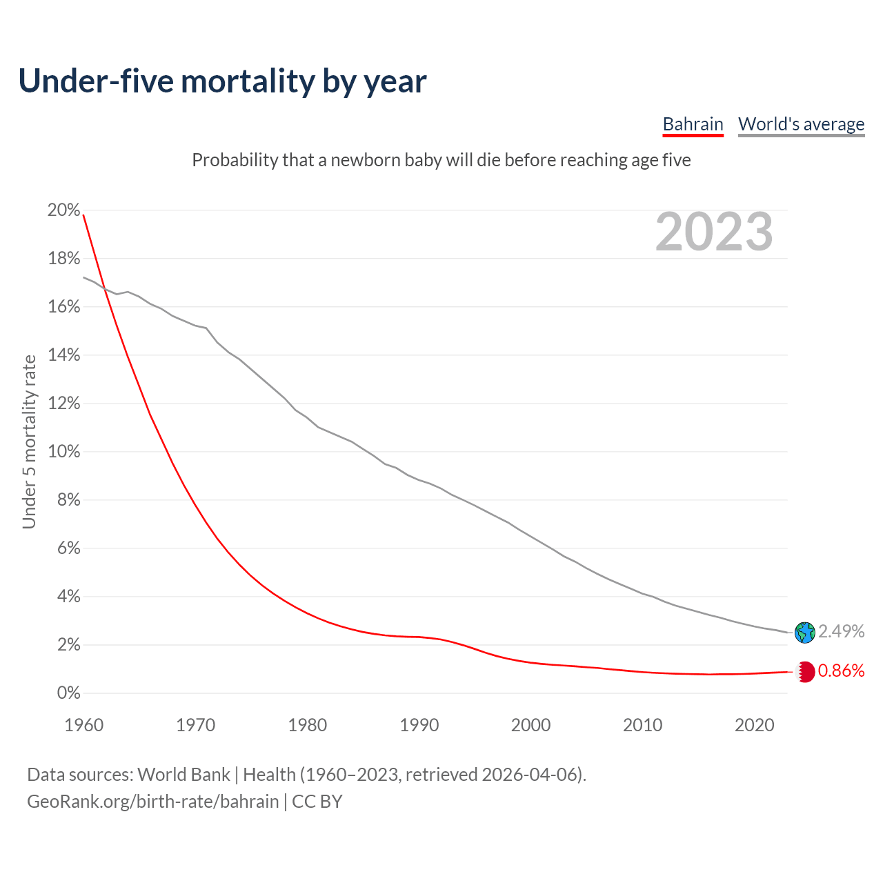 The under-5 mortality rate in Bahrain was 8.6 deaths per 1,000 live births in 2023 — a 0.86% chance that a newborn baby will die before reaching age five. This is down from 12.5 deaths per 1,000 live births in 2000.