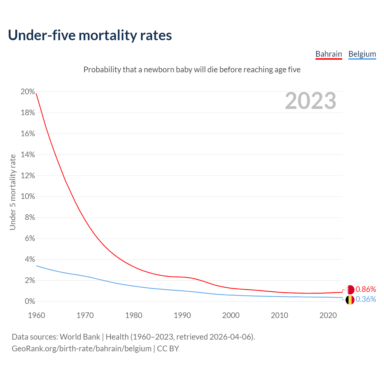 The chance that a newborn baby will die before reaching age five is 0.86% in Bahrain and 0.36% in Belgium. Above is a chart with historical data on under-five mortality rates.
