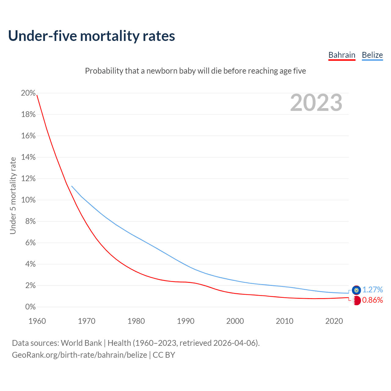 The chance that a newborn baby will die before reaching age five is 0.86% in Bahrain and 1.27% in Belize. Above is a chart with historical data on under-five mortality rates.
