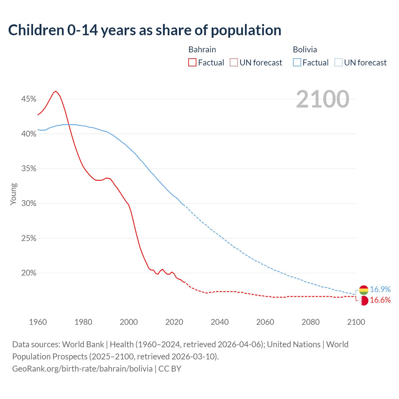 According to the latest available data on birth rates, the fertility rate in Bahrain was 1.82 children per woman in 2023, compared to 2.55 in Bolivia in 2023. The replacement level is considered to be 2.1 children per woman.