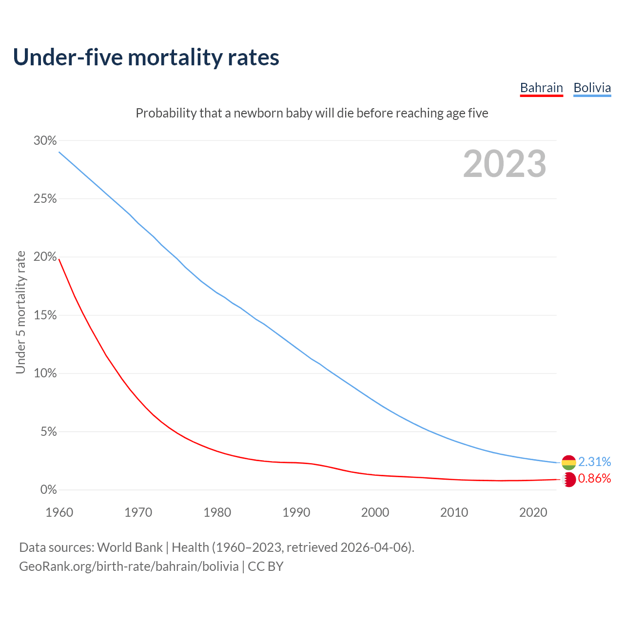 The chance that a newborn baby will die before reaching age five is 0.86% in Bahrain and 2.31% in Bolivia. Above is a chart with historical data on under-five mortality rates.