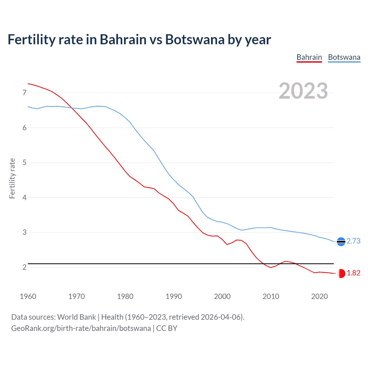 1960 vs 2023, the fertility rate has decreased by 74.9% in Bahrain and by 58.6% in Botswana — in 1960, it was 7.26 and 6.6, respectively.